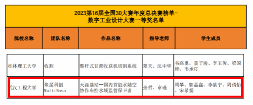 本网讯(通讯员 周攀 李紫宁)12月18日至20日,2023年第16届全国三维数字化创新设计大赛在华中科技大学落下帷幕。经过层层选拔,永乐高本科生参赛作品《天涯基站——国内首创水陆空协作布控水域监管保卫者》从入围决赛的785件作品中脱颖而出,荣获数字工业设计大赛一等奖,创造了学院参加该项赛事以来取得的最好成绩。