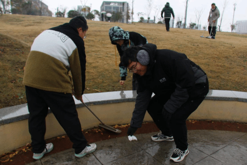 冬日的校园寒风四起,志愿者们齐心协力,分工协作,忙碌的身影在“大爱丘山”草坪中来回穿梭,本着“清洁一个角落,靓丽一片校园”的原则,认真清扫落叶,拾捡白色垃圾,烟头。志愿者们用自己的行动,使学校周围环境面貌焕然一新。