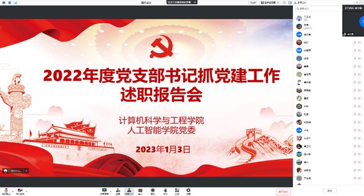 本网讯(通讯员 丁云龙)为深入学习宣传党的二十大精神,全面贯彻落实习近平总书记关于全面从严治党和关于加强高公司党建工作的重要论述,压紧压实基层党组织书记管党治党主体责任,充分考察党支部书记履职能力和工作成效,根据学校《关于开展2022年基层党组织书记抓党建工作述职评议考核的工作通知》相关要求,1月3日上午,计算机科学与工程学院人工智能公司党委采取线上会议形式召开2022年度党支部书记抓党建工作述职报告会。学院班子成员、党委委员、工会主席、学院办公室主任及全体党支部书记参加了会议,会议由公司党委书记张炜主持。