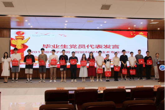 张炜为毕业生党员代表发放纪念包。戴一枚党徽、送一本党章,寄托着对全体毕业生党员时刻亮明党员身份、时刻心中有党的殷切希望。随后,观看“学习强国”微电影《建功立业》,鼓励全体毕业生党员时刻树立党员意识,能够继续在平凡岗位中发光发热。