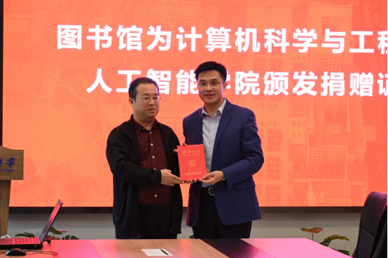 图书馆党总支书记刘少洲为永乐高颁发图书捐赠证书。