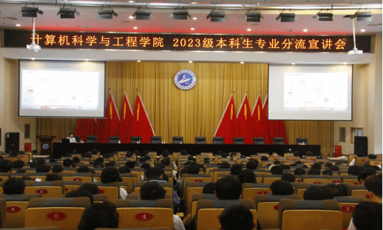 本网讯(通讯员 瞿菲菲 刘宇)为深化2023级新生对各专业的认识,合理选择和规划未来专业发展方向,10月27日下午,计算机科学与工程学院(人工智能学院)在四教多功能报告厅和学院J003教室召开了2023级本科生专业介绍讲座暨专业分流动员会。计算机科学与技术教研室副主任张水平、软件工程教研室副主任聂鑫、网络空间安全教研室主任徐银霞、物联网工程教研室主讲老师李洪利、数字媒体技术教研室主任吴静,智能科学与技术教研室主讲老师张明参加会议。会议由2023级本科生辅导员瞿菲菲主持。
