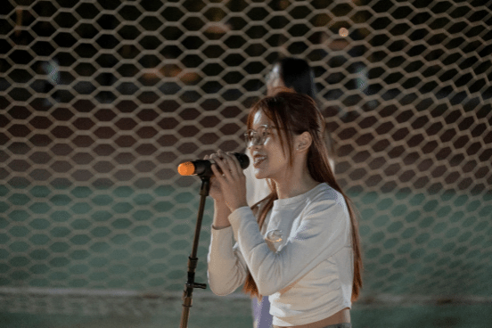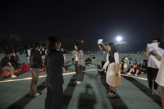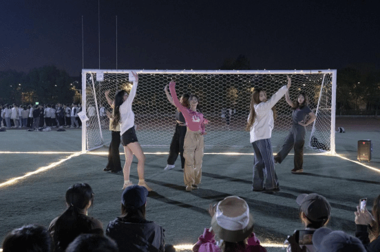 舞动过后,大家围坐在操场上,一同欣赏动听的歌声,表演的同学们自信地放声歌唱,倾情演绎着自己的歌曲。现场更有不少同学自发打开手机闪光灯,低声合唱,闪烁的闪光灯汇聚成属于同学们的灯海,在夜中闪耀光芒,传递青春活力。